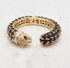 À son sommet trône avec majesté une tête de tigre incrustée de strass, ajoutant une touche de férocité à l'ensemble. Cette union audacieuse de matériaux et de motifs crée une symbiose entre la force du tigre et l'éclat contemporain des strass, faisant de ce jonc un accessoire exceptionnel qui ne passe pas inaperçu. Portez ce bijou à votre poignet et incarnez la puissance et le style avec chaque mouvement.