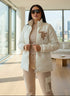 • Pantalons avec poches : Design pratique et esthétique. • Doudoune blanche motifs gris argentés : Logo en strass dorés pour une touche de luxe. • Tee-shirt uni : Harmonie avec le pantalon.